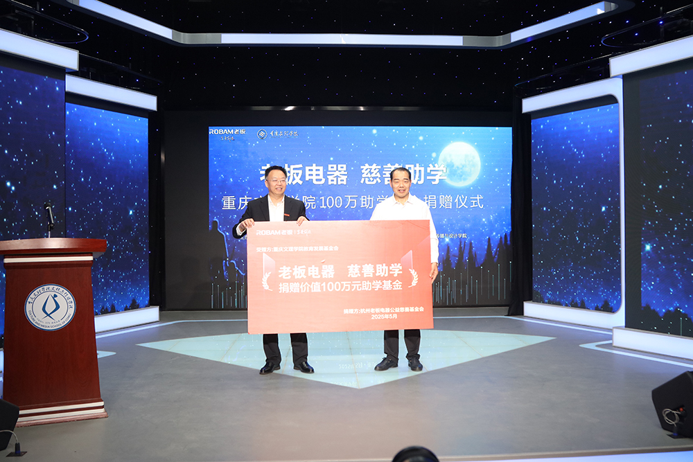 5月7日上午,学校与老板电器企业举行校企合作捐赠仪式。老板集团党委副书记唐根泉、老板电器重庆营销中心总经理孙江伟、老板电器共富办主任徐美华、永川区生态环