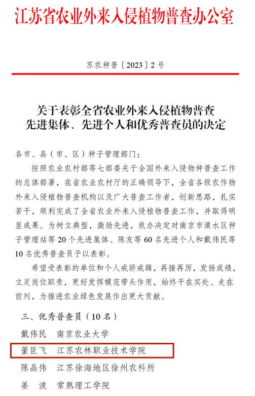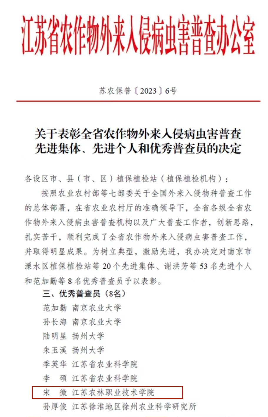 2023年12月5日,江苏省农作物外来入侵病虫害普查办公室举行了江苏省农作物外来入侵病虫害普查技术培训暨工作总结交流会。会议对普查先进集体、先进个人及优秀普查员进行了表彰,风景园林学院的宋微老师被评为优秀普查员(全省共8名)。2023年12月29日,江苏省农业外来入侵植物普查办公室发文表彰全省农业外来入侵植物普查先进集体、先进个人和优秀普查员,董臣飞老师被评为优秀普查员(全省10名)。学院在徐州铜山区、淮安金湖县等区县开展的普查工作支撑当地农业部门荣获“先进集体”称号。