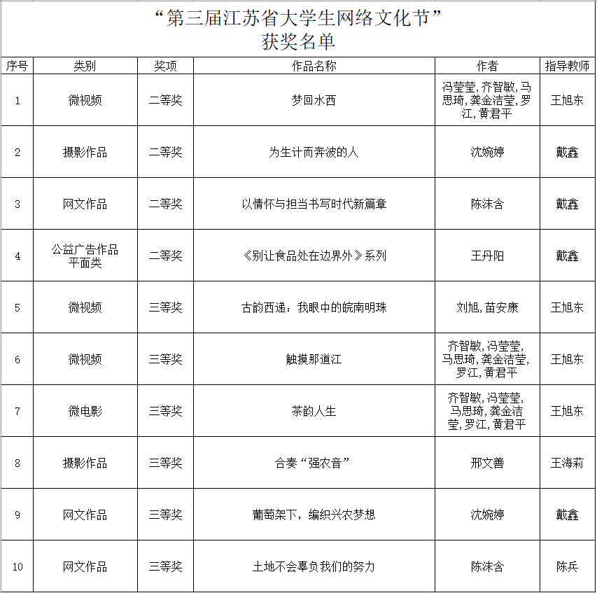 在由中共江苏省委教育工委、江苏省教育厅主办的第三届江苏省大学生网络文化节暨高校网络育人优秀作品推选展示活动中,威尼斯官网共10件作品获奖,其中二等奖4项、三等奖6项。