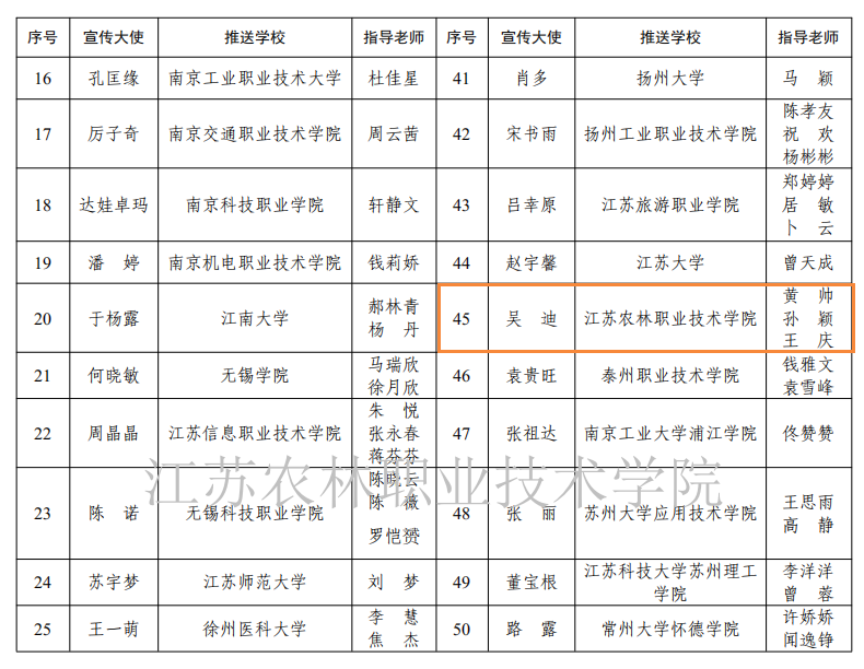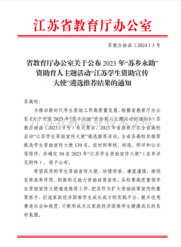 根据省教育厅办公室《关于公布2023年“苏乡永助”资助育人主题活动“江苏学生资助宣传大使”遴选推荐结果的通知》,农学园艺学院吴迪同学荣获“江苏学生资助宣传大使”称号。