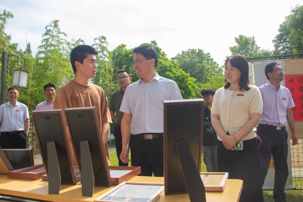 活动现场,简祖平认真听取学生讲解作品的创作主题、创作方式、文化背景等信息,体验了漆扇制作,感受非遗技艺的魅力。他对茅山校区加强美育融入,推动品牌塑造,培育美育文化,引领美育风尚的特色美育工作给与了高度肯定,鼓励“六点半大美课堂”的学员们再接再厉,再创佳绩。