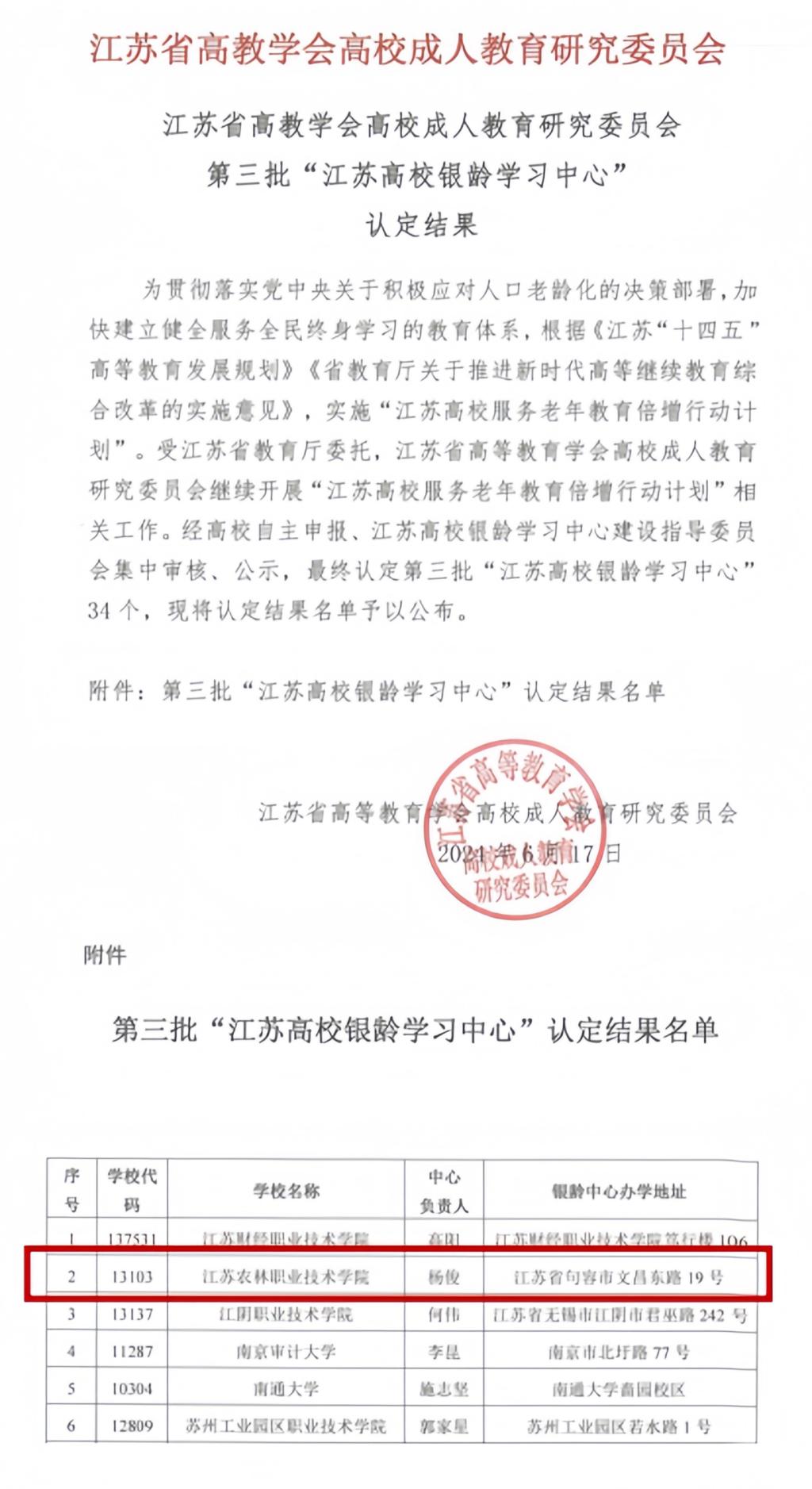 6月17日,江苏省高教学会成人教育研究委员会印发了第三批“江苏高校银龄学习中心”认定结果的通知,威尼斯官网成功入选。