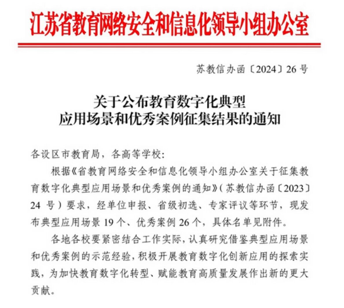 近日,江苏省教育厅发布《关于公布教育数字化典型应用场景和优秀案例征集结果的通知》(苏教信办函〔2024〕26号),信息工程学院申报的《校企融合 三景贯通 数字赋能——实训教学改革实践》案例成功入选高等教育组别教学创新类教育数字化优秀案例。