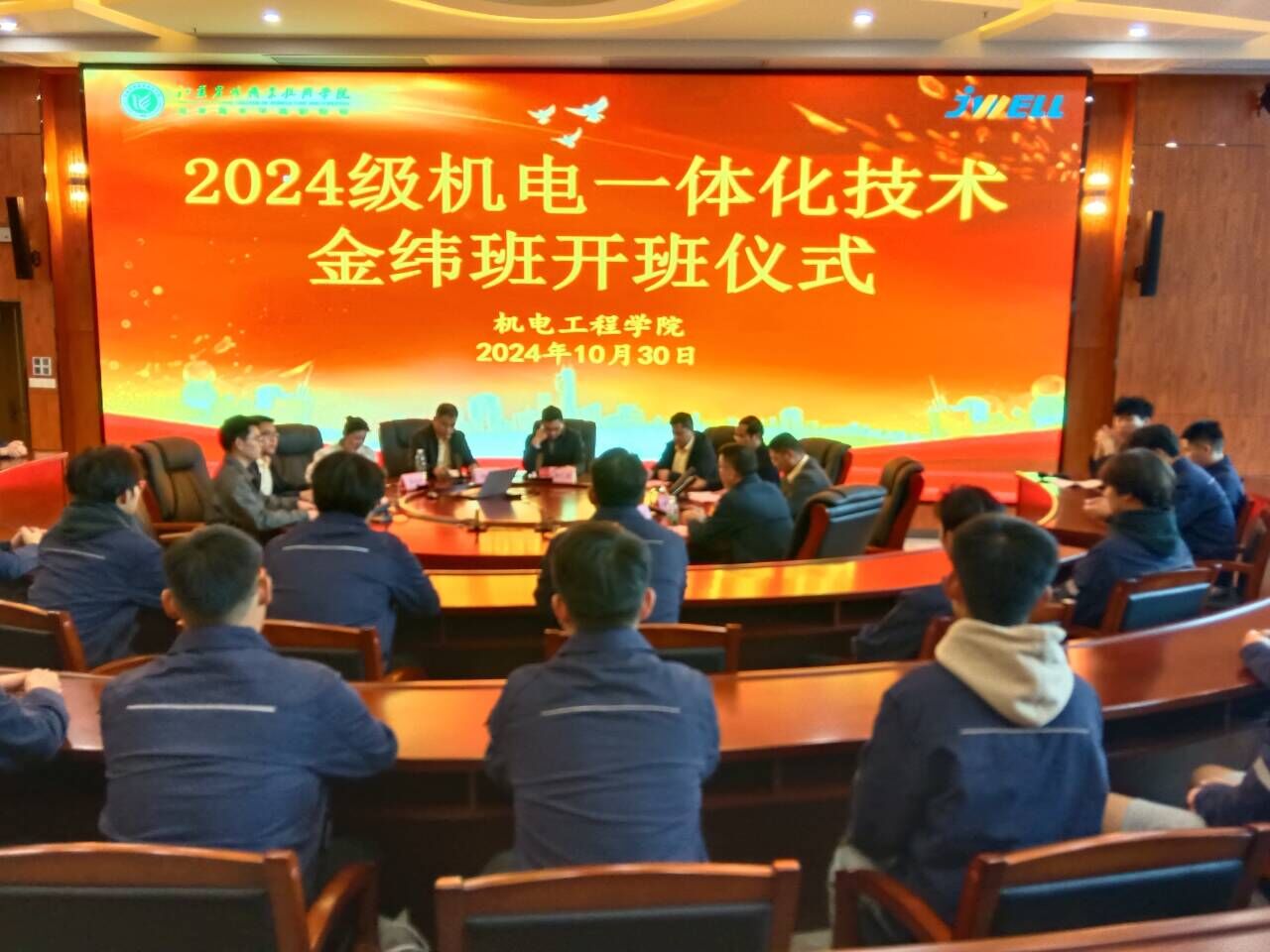 10月30日下午,机电工程学院2024级金纬班开班仪式在大学生艺术中心107举行。学院党委副书记曹仁勇,机电工程学院院长刘永华、党总支副书记乔小倩,金纬机械有限公司轮值董事长周兵,总经理袁新星等集团领导,金纬班相关专业教师及22级、23级、24级全体学生参加了开班仪式。开班仪式由机电工程学院院长刘永华主持。