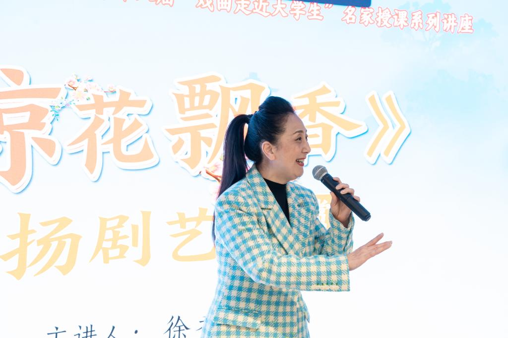 徐秀芳和高飞两位江苏省政协委员、国家一级演员分别结合自己的从艺经历细致全面地介绍了扬剧和京剧的发展历史、唱腔及特色,声情并茂地演唱了多个经典唱段,赢得了现场师生的阵阵掌声,并纷纷拿出手机记录精彩瞬间。作为老艺术家、国家级非物质文化遗产扬剧项目代表性传承人,徐秀芳老师通过分享获得中国戏剧梅花奖和上海白玉兰奖的不凡经历,生动诠释了“吃得苦中苦,方为人上人”。高飞老师作为京剧中青年骨干力量,在讲座中回顾了跟随恩师江苏省时代楷模、已故著名京剧表演艺术家黄孝慈老师的学艺点滴,深情讲述了黄老师“从用心传承到德艺双馨的戏曲人生”,全场为之动容。两位老师还分别以唱腔发展创新、人物塑造和参加音乐剧表演等方面阐述了坚守、传承与创新。