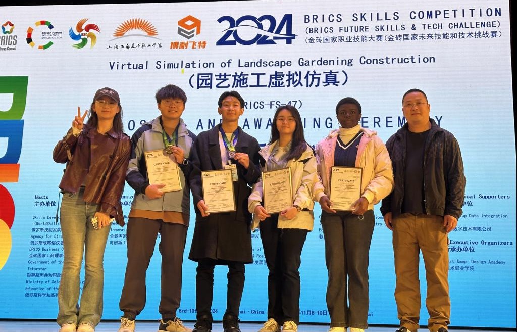 近日,2024金砖国家职业技能大赛园艺施工虚拟仿真赛项中国分赛区国际总决赛在上海工艺美术职业学院嘉定校区圆满闭幕。本次总决赛吸引了共计50支国内参赛队和5支国际参赛队进行线下角逐。由风景园林学院王剑、吴冬老师指导的留学生SEANGSOULY LIFEI(老挝人民民主共和国)、LEE CHANG YOU(马来西亚)两位同学荣获国际参赛队(线下)一等奖及国际总决赛银奖。