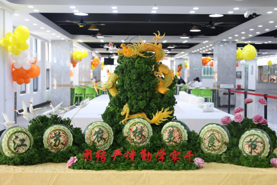 开幕式结束后,学院领导和嘉宾参观了学生食堂,共同分享了4米长的美食节大蛋糕,并欣赏了栩栩如生的果蔬雕刻,现场洋溢着欢乐的气氛。