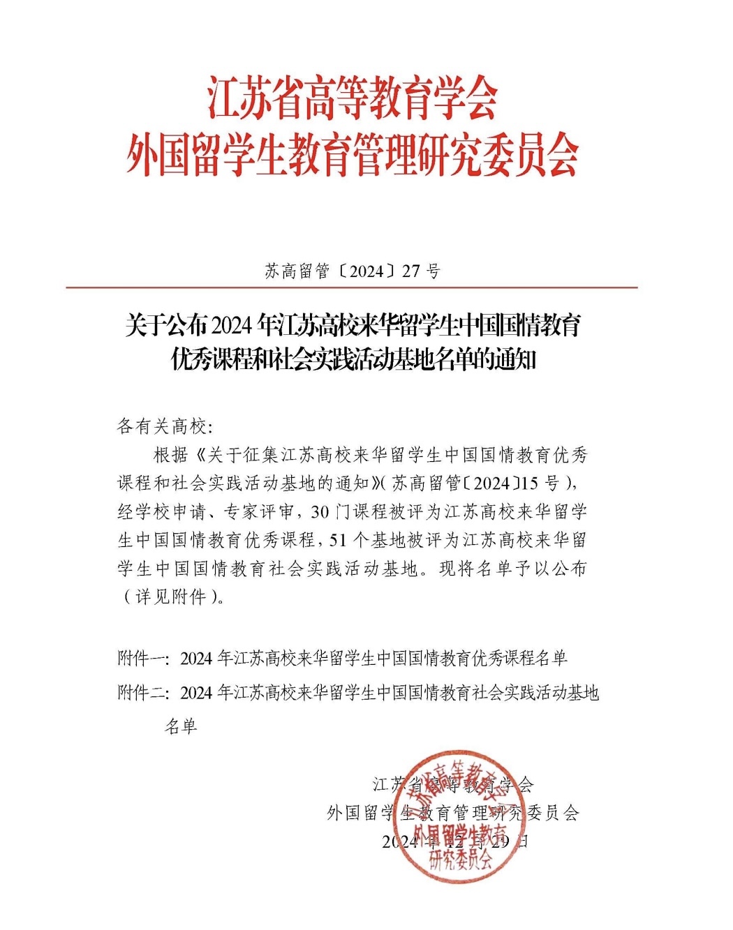 近日,江苏省高等教育学会外国留学生教育管理研究委员会发布了《关于公布2024年江苏高校来华留学生中国国情教育优秀课程和社会实践活动基地名单的通知》,江苏农博园获批2024年江苏高校来华留学生中国国情教育社会实践活动基地。